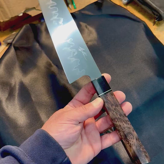 This Gyuto is made from Japanese white #1 and differentially hardened to 62 Rockwell with a beautiful choji hamon. The art polish is up to 5000 grit to bring out the beauty of the heat treatment And crystalline structure. This blade is light and nimble with distal taper and a perfect slight convex grind.