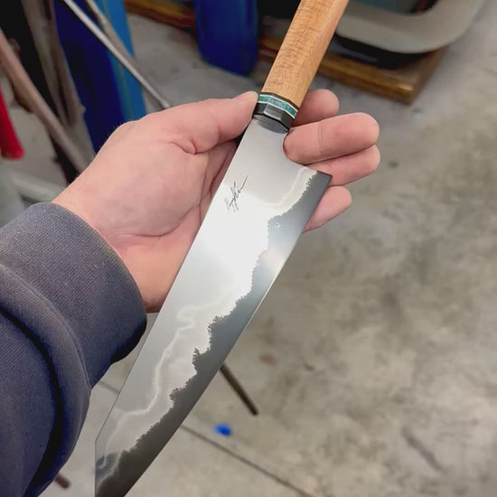 This super thin gyuto is forged from San mai with a 410 stainless jacket for corrosion resistance and ductility with a Hitachi blue#1 carbon core for Extremely well edge holding and sharpness.