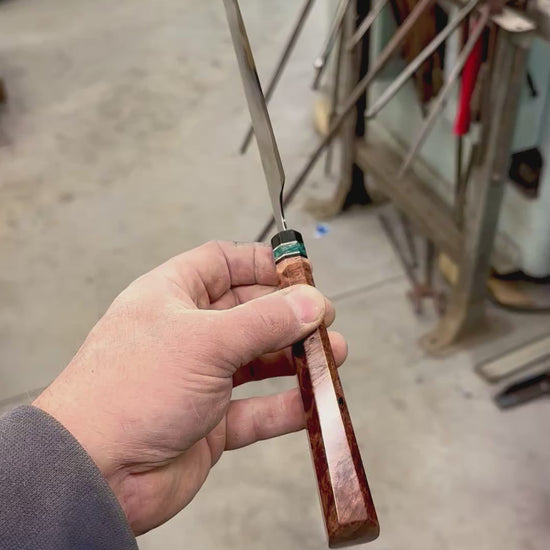 This sweet Ktip gyuto is forged from 410 stainless cladding with a Hitachi blue#1 core In a san mai construction! Super thin edge With a Rockwell hardness of 62. The steel will hold an amazing edge and incredible sharpness!