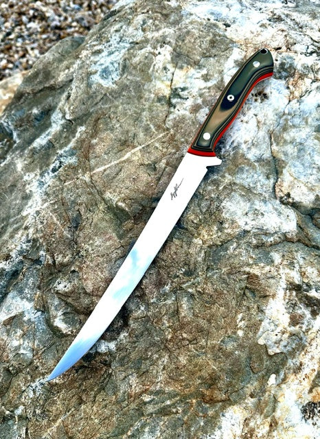 This 9" fillet is made from NitroV stainless steel and is at 61 Rockwell hardness. Incredible edge retention and corrosion resistance. This is a perfect knife for filleting just about anything but really shines with fluke, salmon, bass, tuna. The handle is non slip ultrex g10. carbon kydex sheath included.
